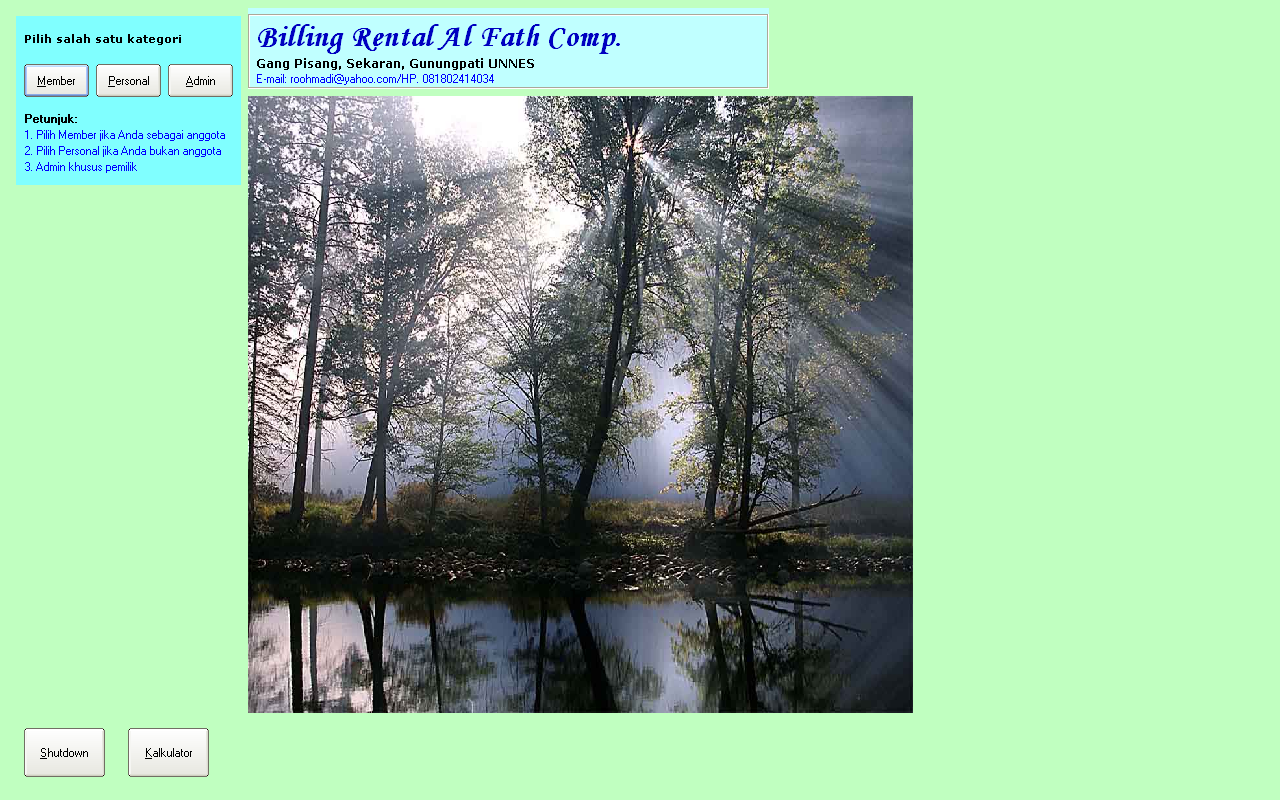 Pada form ini, user akan menghadapi sebuah tampilan fullscreen, sehingga user harus memilih kategori untuk login dan menggunakan komputer. Login dibagi menjadi 3 jenis: Member, Personal, dan Admin. Member: jika user memilih kategori ini, maka perhitungan waktu sewa akan berbeda, user akan mendapatkan sejumlah potongan harga sewa sebagai imbalan telah menjadi member. Untuk memilih kategori ini, user harus mendaftarkan diri dulu.