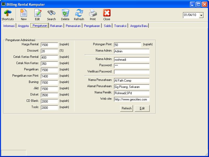 Bagian di atas mencatat pengaturan harga per item yang ada, dan data usaha rental komputer yang dimiliki.