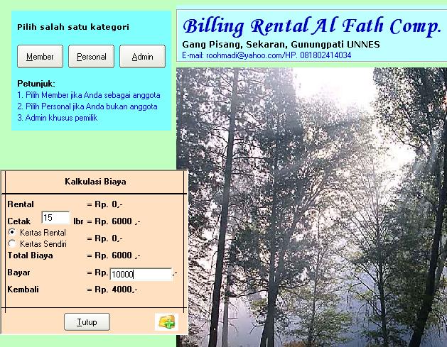Dengan logika yang sederhana ini, kita bisa membuat sendiri billing untuk rental komputer. Dan kemudian ditambah sedikit database, kita bisa mengetahui dalam sehari, berapa rupaih hasil sewa komputer dan dalam sebulan berapa rupiah hasil sewanya. Jika kita ingin tahu saldo untuk dari sewa jasa komputer, kita bisa menambahkan menu lain, yaitu menu pengeluaran dan pemasukan lain. Dan pada menu yang lain kita bisa membuat kalkulasi saldo dalam satu bulan berapa keuntungan jasa rental komputer kita.